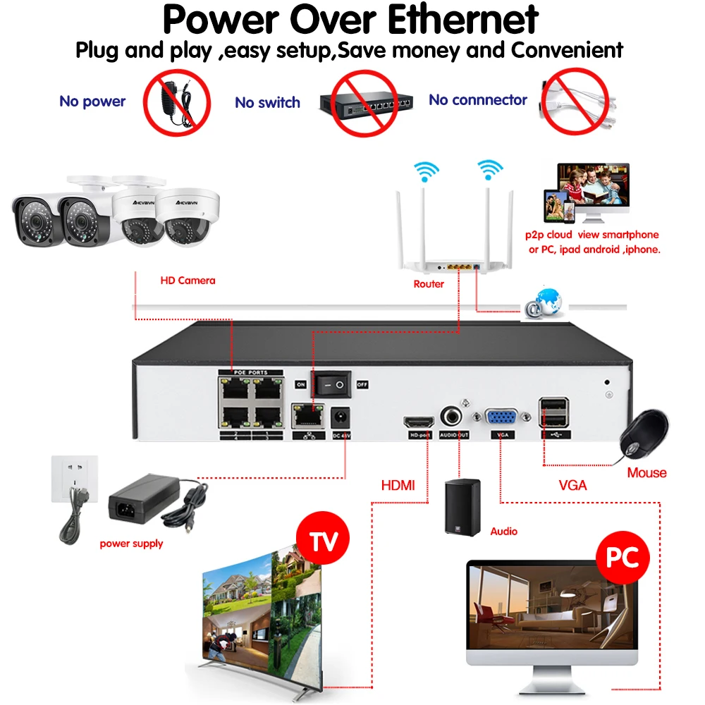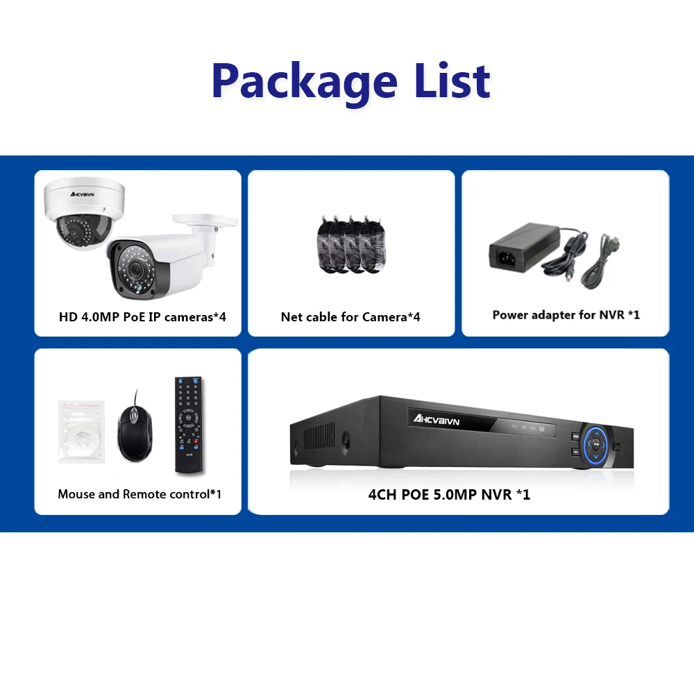 HD 4CH 5MP 1080P HDMI 48V POE 5MP NVR CCTV Camera System Outdoor Security 4.0MP IP Camera P2P Video