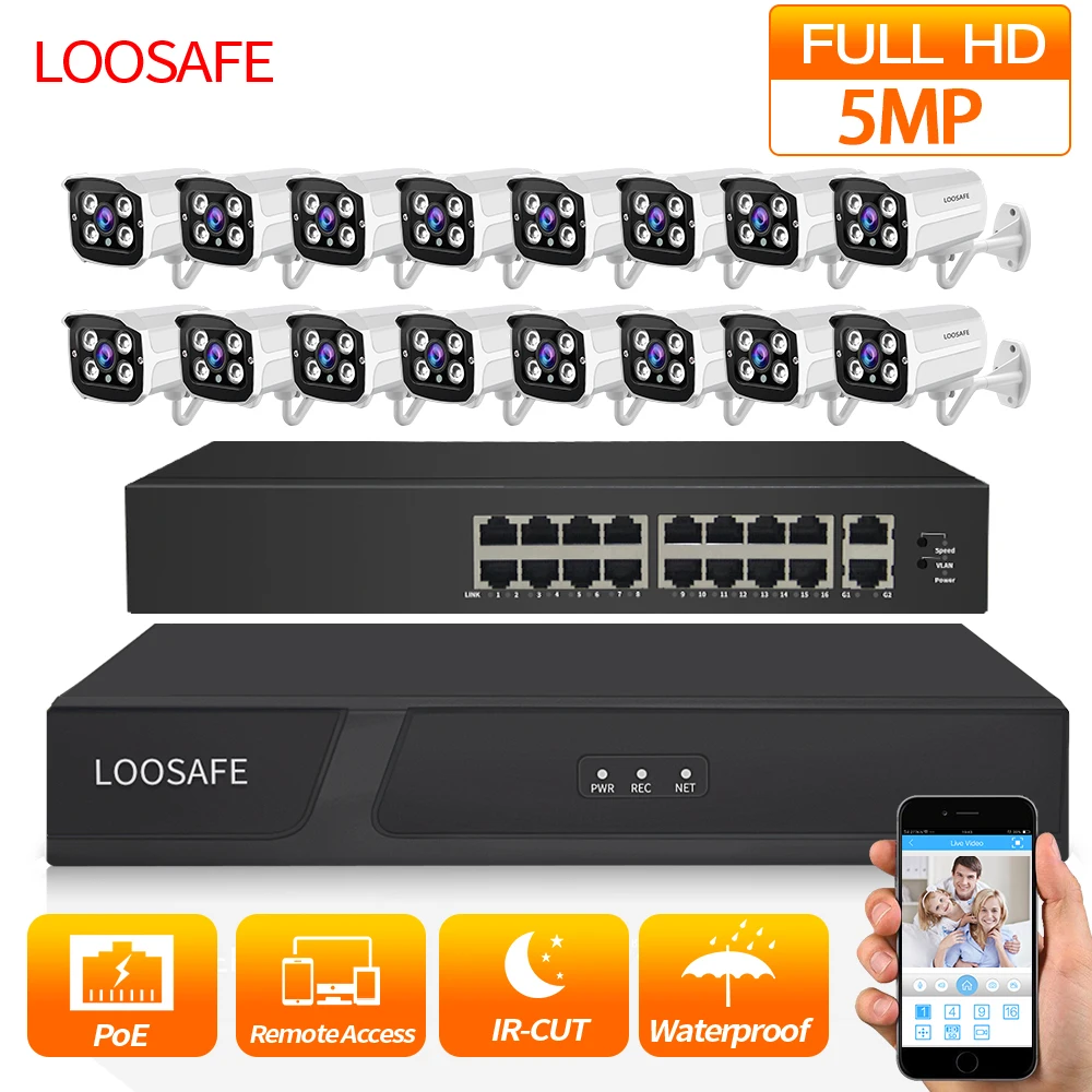 HOT SALE LOOSAFE Outdoor video surveillance Security Camera Kit System HD CCTV DVR 16PCS 5.0 MP IR POE Surve